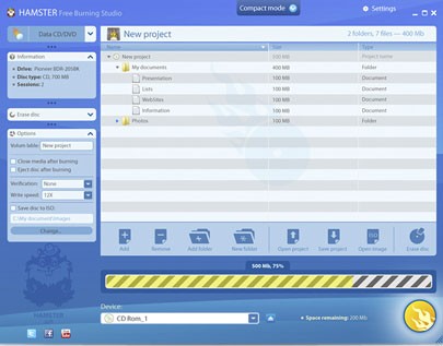 Phần mềm Burning Studio do Hamster phát triển là một công cụ ghi đĩa miễn phí, có khả năng tự động xác định loại đĩa được lắp vào, cũng như dung lượng và tốc độ ghi tối ưu. Thông tin này được sử dụng để hiển thị mức độ sử dụng dung lượng của các tệp trên ổ đĩa, đồng thời hỗ trợ xóa đĩa để chuẩn bị cho việc ghi mới.