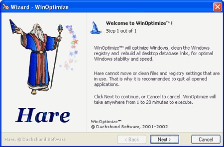 Chương trình cung cấp khả năng tối ưu hóa các thành phần quan trọng như Registry và tăng tốc hệ điều hành. Để thực hiện, bạn chọn Wizard> WinOptimize, rồi nhấn Next. Hare sẽ tiến hành đọc thông tin từ Registry của bạn.