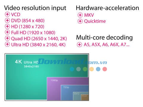 - Hỗ trợ xem video MKV với độ phân giải cao, bao gồm 2K (2560 x 1440) và 4K (3840 x 2160), tương thích với các thiết bị iPhone 5S, iPad Air và iPad Mini Retina.