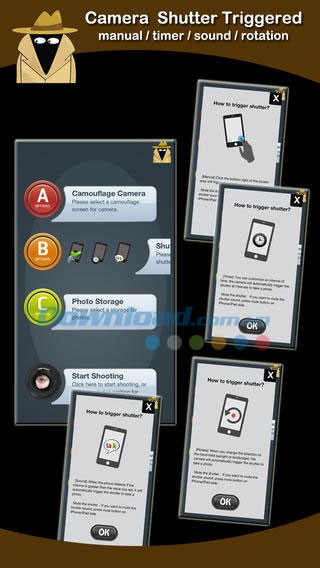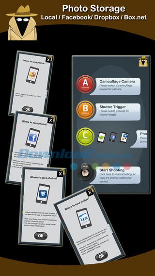 Camouflage Camera, Shutter Trigger, Photo Storage và Start Shooting là những công cụ đắc lực, giúp bạn kiểm soát hoàn toàn quá trình chụp ảnh bí mật.