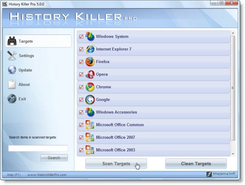Điểm nổi bật của History Killer Pro là sự thân thiện với người dùng, cùng với một giấy phép sử dụng vĩnh viễn. Giải pháp này thực hiện dọn dẹp toàn diện các tập tin tạm thời của hệ điều hành Windows, các file rác từ bộ ứng dụng MS Office, thùng rác, các bản ghi không còn giá trị, các file index.dat, cookies, cache và lịch sử duyệt web.