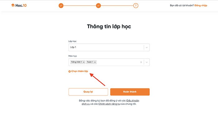 - Cuối cùng, nhấn Hoàn thành để xác nhận và kết thúc quá trình đăng ký tài khoản Hoc10.vn.