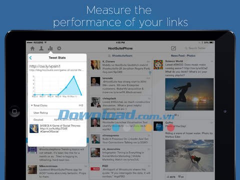 - HootSuite cung cấp số liệu thống kê chi tiết về số lượt nhấp (click) vào các liên kết đã chia sẻ, đặc biệt là các liên kết rút gọn qua Ow.ly, trong mục My Tweets.