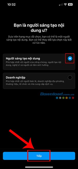 Bước 4: Chọn giữa vai trò Người sáng tạo nội dung hoặc Doanh nghiệp, sau đó nhấn Tiếp để tiếp tục quá trình thiết lập.