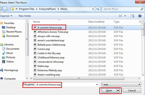 Trong trường hợp Everyone Piano chưa được khởi động, bạn có thể mở bản nhạc bằng cách điều hướng đến thư mục EOP và nhấp đúp vào tệp EOP cần phát. Chương trình sẽ tự động khởi động và bắt đầu phát nhạc.