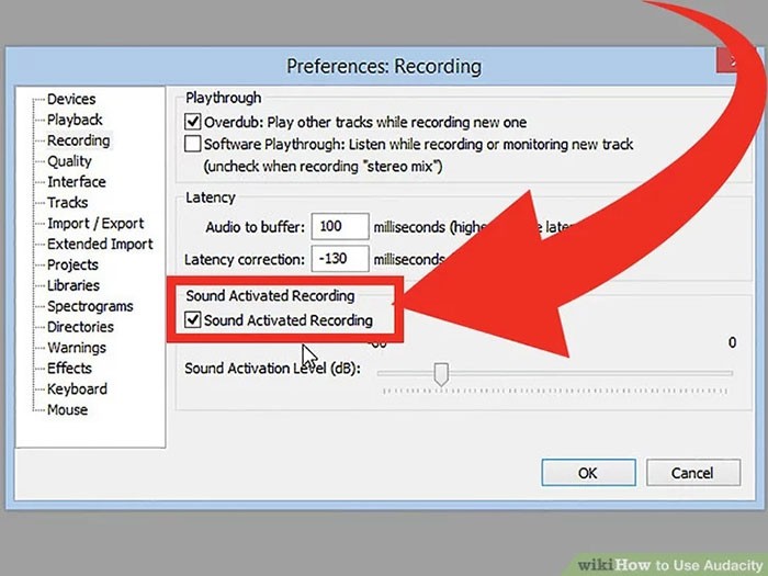 Hoặc, kích hoạt Sound Activated Recording trong phần tùy chọn Recording. Đánh dấu vào ô Sound Activated Recording và điều chỉnh mức Sound Activation Level (dB). Mức dB càng thấp, âm thanh ghi âm sẽ nhạy cảm hơn với các tín hiệu nhỏ. Tính năng này đặc biệt hữu ích khi ghi âm trong một phòng khác, giúp tránh các khoảng lặng quá dài ở đầu bản nhạc.