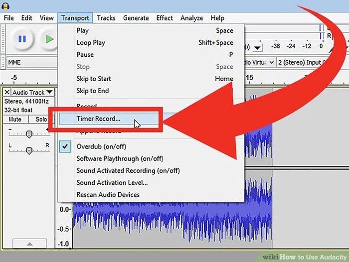 Từ menu Transport, chọn Timer Record hoặc nhấn tổ hợp phím Shift-T. Trong cửa sổ mới mở, bạn có thể đặt thời gian bắt đầu và kết thúc cho quá trình ghi âm.