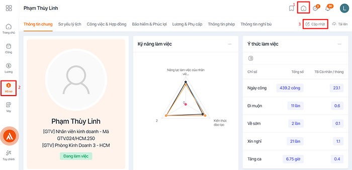 Ngoài ra, cùng với Sơ yếu lý lịch, khu vực này còn cung cấp một cái nhìn tổng quan về các thông tin liên quan đến Công việc hiện tại, Hợp đồng lao động, các khoản Bảo hiểm và Phúc lợi, chính sách Lương thưởng và Phụ cấp, cũng như Thông tin về lịch nghỉ phép, giúp người dùng dễ dàng theo dõi và quản lý.