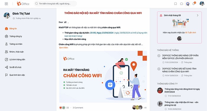 Trang cá nhân trên 1Office được thiết kế để hỗ trợ người dùng quản lý và theo dõi công việc một cách hiệu quả. Nền tảng này cung cấp một loạt các tính năng quan trọng.