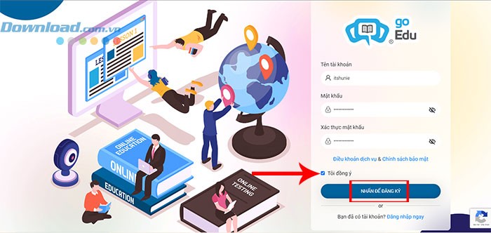 Sau đó, hãy chọn Tôi đồng ý để xác nhận bạn đã đọc và chấp nhận các điều khoản sử dụng. Cuối cùng, nhấn vào Nhấn để đăng ký để hoàn tất quá trình tạo tài khoản IOE.