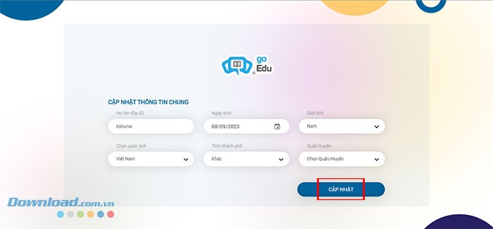 Bước 3: IOE sẽ yêu cầu bạn Cập nhật thông tin chung của học sinh. Hãy đảm bảo cung cấp thông tin chính xác và đầy đủ, sau đó nhấn Cập nhật.