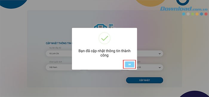 Một cửa sổ xác nhận sẽ hiện ra, hãy chọn OK để xác nhận việc cập nhật thông tin thành công.