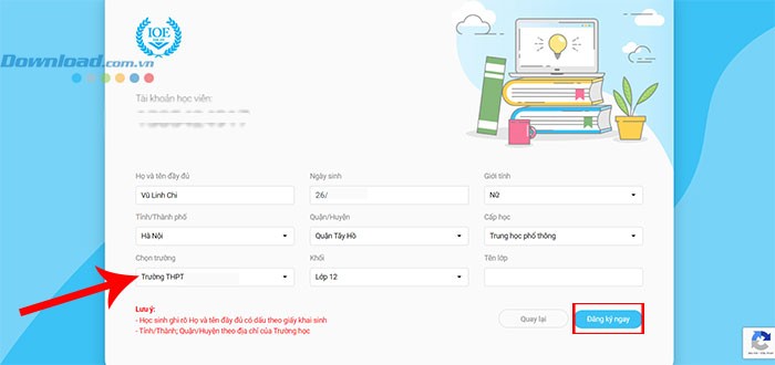 Bước 5: Cung cấp Hoàn thiện thông tin cụ thể của học sinh, bao gồm Cấp học, Trường, Khối,... và nhấn Đăng ký ngay.