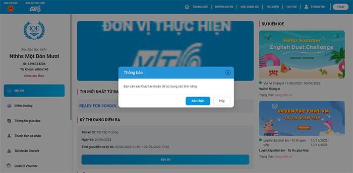 Sau khi hoàn tất việc nhập thông tin giáo dục, hệ thống sẽ yêu cầu xác thực tài khoản IOE để sử dụng đầy đủ các tính năng. Việc xác thực này cũng giúp bảo mật tài khoản và hỗ trợ khôi phục mật khẩu, đồng thời cho phép học sinh tham gia các kỳ thi chính thức. Hãy bấm Xác nhận để đăng ký số điện thoại xác thực.