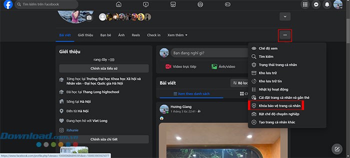 Tiếp theo, nhấp vào biểu tượng ba dấu chấm nằm ở góc phía trên, bên phải màn hình. Một menu sẽ hiện ra, từ đó bạn chọn mục Khóa bảo vệ trang cá nhân.