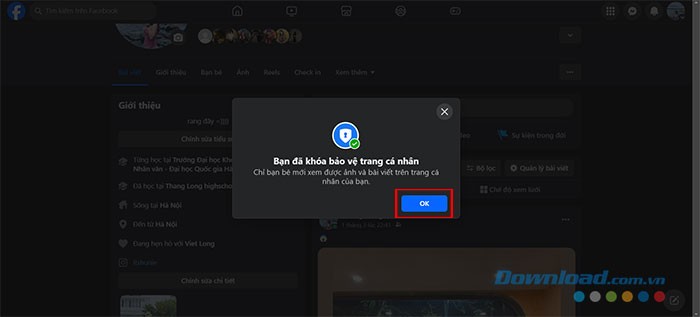 Khi quá trình hoàn tất, một thông báo xác nhận việc khóa bảo vệ trang cá nhân sẽ được hiển thị. Hãy nhấn nút OK để kết thúc.