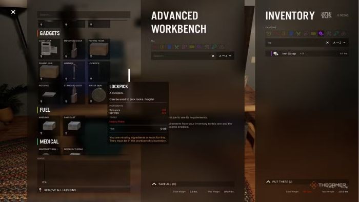Lockpick có thể bị hao mòn trong quá trình sử dụng, do đó việc tự mình chế tạo là một lựa chọn tối ưu. Để thực hiện việc này, người chơi cần chuẩn bị những thứ sau: