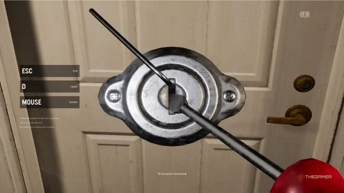 - Sử dụng chuột để xoay lockpick một cách cẩn thận, sau đó nhấn phím D để tiến hành thử mở khóa.