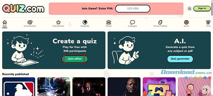 - Quiz.com được biết đến là một nền tảng trực tuyến, cho phép người dùng tự tạo và chia sẻ các câu đố. Nơi đây, bạn có thể tự mình tạo ra những câu hỏi trắc nghiệm thú vị, kiểm tra kiến thức bản thân, hoặc tham gia thi đấu với bạn bè. Thêm vào đó, ứng dụng này còn có sẵn trên Steam, cung cấp hàng ngàn câu đố miễn phí để bạn trải nghiệm.