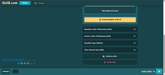 Bước 6: Sau khi đã hoàn thiện một slide câu hỏi, hãy nhấn vào dấu cộng để chuyển sang tạo slide tiếp theo.
