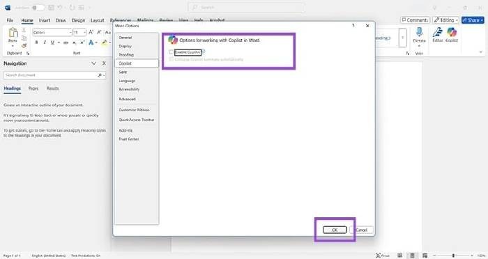 Bước 5: Cuối cùng, nhấn OK để lưu thay đổi. Khi đó, biểu tượng Copilot sẽ chuyển sang màu xám, cho biết tính năng này đã được tắt hoàn toàn trong Word.