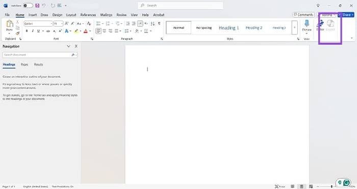 Bước 1: Khởi động Microsoft Word với một tài liệu mới. Bạn sẽ nhận thấy biểu tượng Copilot với thiết kế cầu vồng xuất hiện ở góc phải phía trên màn hình.