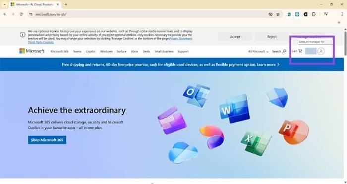 Bước 1: Truy cập trang web chính thức của Microsoft bằng trình duyệt web ưa thích và tiến hành đăng nhập bằng tài khoản Microsoft cá nhân của bạn. Sau khi đăng nhập thành công, hãy tìm kiếm tên người dùng ở góc phía trên bên phải màn hình và chọn vào đó để mở khu vực quản lý tài khoản.