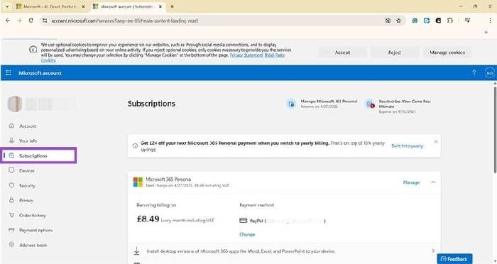 Bước 2: Trong khu vực quản lý tài khoản, chọn mục Subscriptions để xem danh sách các gói Microsoft Office mà bạn đang sử dụng.