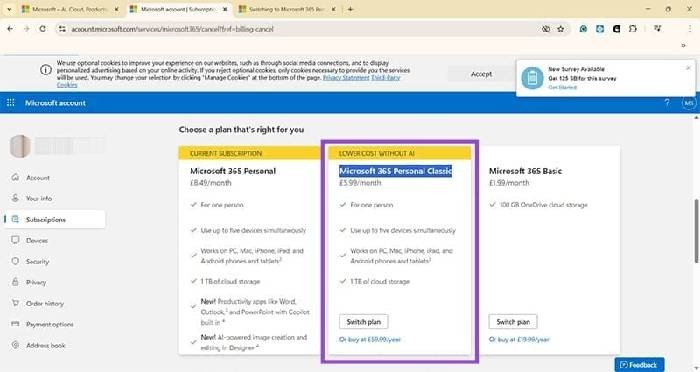 Bước 4: Tại bước này, bạn sẽ được đề xuất chuyển sang một gói Microsoft 365 không tích hợp AI, tương tự như gói hiện tại nhưng có mức chi phí thấp hơn và không bao gồm Copilot.