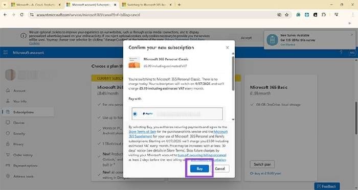 Bước 5: Đọc kỹ các điều khoản và ngày có hiệu lực của việc chuyển đổi gói, vì Microsoft thường áp dụng thay đổi vào chu kỳ thanh toán tiếp theo. Trong thời gian chờ đợi, bạn có thể sử dụng phương pháp tạm thời tắt Copilot trong Word như đã hướng dẫn trước đó. Khi đã sẵn sàng, nhấn Buy và làm theo các hướng dẫn hiển thị trên màn hình.