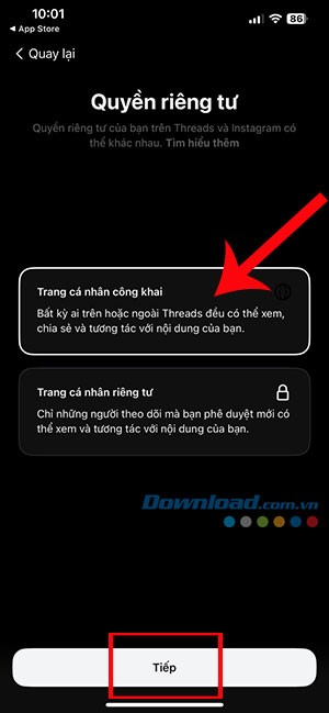 Bước 3: Thiết lập Quyền riêng tư cho tài khoản Threads của bạn và nhấn Tiếp. Nếu bạn muốn mọi người đều có thể xem các bài đăng của mình, hãy chọn Trang cá nhân công khai. Trong trường hợp bạn chỉ muốn những người bạn đã phê duyệt được xem nội dung, hãy chọn Trang cá nhân riêng tư.