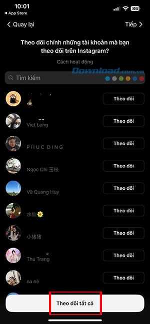 Bước 4: Do Threads yêu cầu tài khoản Instagram để hoạt động, bạn sẽ được đề xuất theo dõi những người bạn đang theo dõi và những người đang theo dõi bạn trên Instagram. Nhấn Theo dõi bên cạnh tên người dùng bạn muốn kết nối hoặc chọn Theo dõi tất cả để theo dõi tất cả.