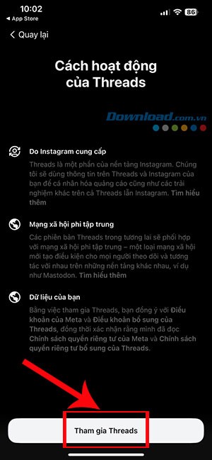 Bước 4: Cuối cùng, nhấn vào Tham gia Threads để hoàn tất quá trình và bắt đầu khám phá, chia sẻ những bài viết đầu tiên trên mạng xã hội mới này.