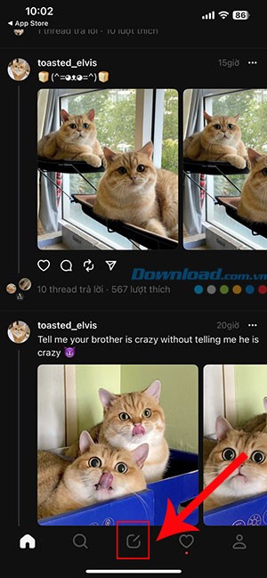Bước 1: Quá trình đăng bài trên Threads bắt đầu bằng việc người dùng chạm vào biểu tượng bút viết được đặt ở vị trí trung tâm màn hình.