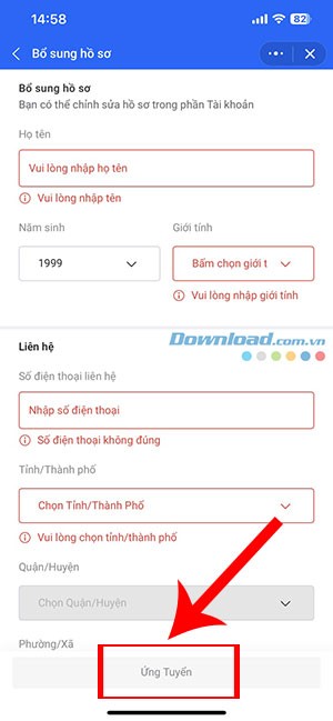 Bước 5: Điền đầy đủ các thông tin cần thiết để Bổ sung hồ sơ cá nhân. Sau đó, nhấn nút Ứng tuyển để hoàn tất việc gửi hồ sơ xin việc.