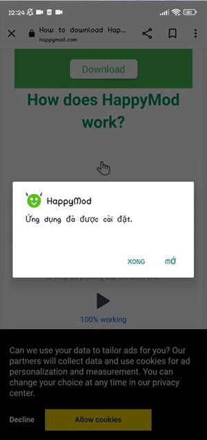 Bước 5: Thực hiện theo các hướng dẫn hiển thị trên màn hình và chờ đợi cho đến khi ứng dụng HappMod được cài đặt thành công. Biểu tượng ứng dụng sẽ xuất hiện trên màn hình chính, cho phép bạn bắt đầu sử dụng.