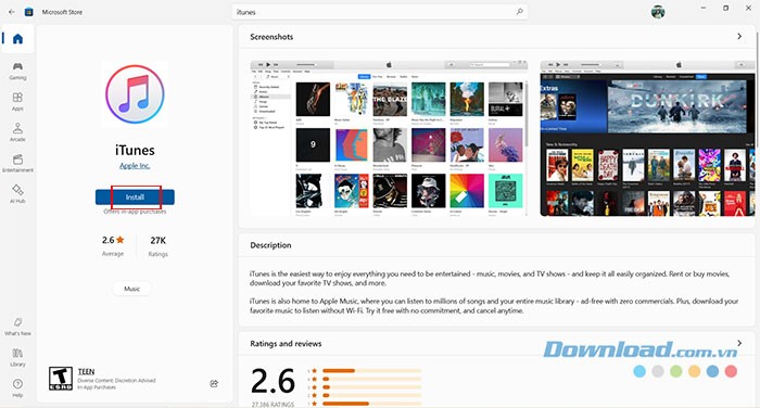 Bước 2: Nhấn vào nút Install trên trang giới thiệu iTunes để bắt đầu quá trình tải xuống phần mềm.
