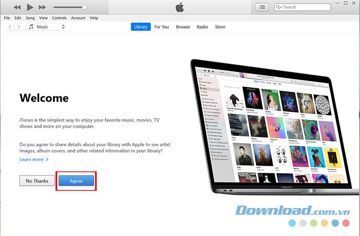 Bước 5: Trên màn hình chào mừng, bạn có thể chọn Agree nếu muốn chia sẻ thông tin chi tiết về thư viện nhạc của mình với Apple. Hoặc chọn No, Thanks để từ chối việc chia sẻ này.