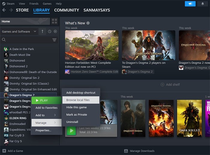 - Sau đó, nhấp chuột phải vào mục Dragon's Dogma 2, chọn Manage và nhấn vào Browse Local Files.