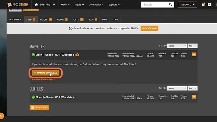 Bước 4: Trên trang của bản mod, hãy cuộn xuống để xem thông tin chi tiết, các tệp đi kèm, hình ảnh minh họa và các tùy chọn khác. Sau đó, chọn tab Files và tìm nút Manual Download (nút đầu tiên trong danh sách).