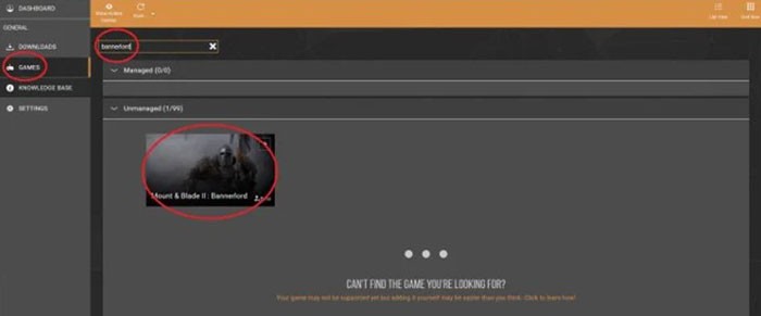 Tiếp theo, chuyển sang tab Games (nằm ở phía bên trái giao diện công cụ). Nhập Bannerlord vào thanh tìm kiếm và chọn biểu tượng trò chơi tương ứng. Từ thời điểm này, Vortex sẽ hỗ trợ Mount and Blade 2 trong việc tải xuống các mod.