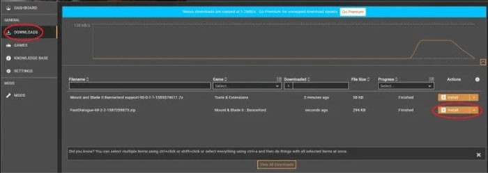 Sau đó, mở công cụ Vortex và chuyển đến tab Download để kiểm tra danh sách các mod đã tải xuống cho Mount and Blade 2 Bannerlord. Nhấn vào nút Install cạnh mod để tiến hành cài đặt tự động.