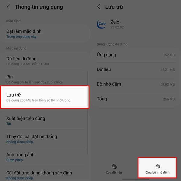 Truy cập Cài đặt trên thiết bị của bạn > chọn Ứng dụng > tìm và chọn Zalo > nhấn vào mục Lưu trữ > cuối cùng, chọn Xóa bộ nhớ đệm hoặc Xóa bộ nhớ cache.