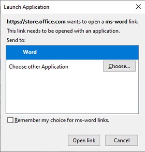 Bước 6: Một lời nhắc sẽ xuất hiện, chọn Word > Open Link để mở Microsoft Word và tiến hành cài đặt tiện ích mở rộng.
