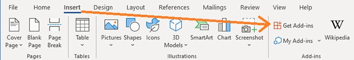 Bước 2: Chọn tab Insert trên thanh ribbon và nhấn vào Get Add-ins. Một cửa sổ mới sẽ mở ra trong Microsoft Word.