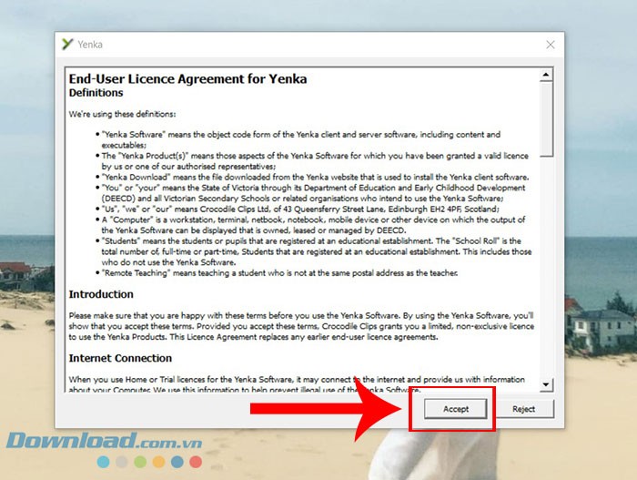 Bước 6: Để tiếp tục, hãy nhấn Accept nhằm xác nhận sự đồng ý của bạn với các điều khoản và điều kiện sử dụng của Yenka.