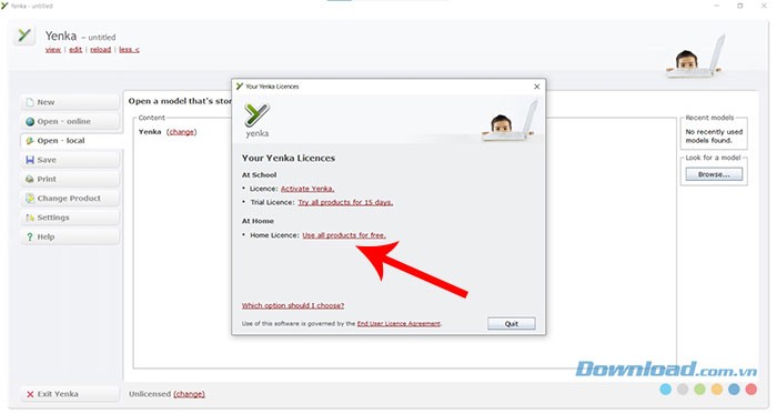 Bước 1: Ngay sau khi khởi động chương trình, Yenka sẽ đưa ra hai lựa chọn về giấy phép sử dụng: At School và At Home. Người dùng có thể lựa chọn Home License để trải nghiệm Yenka hoàn toàn miễn phí tại nhà, hoặc chọn Trial License để dùng thử bản quyền trong vòng 15 ngày tại môi trường trường học.