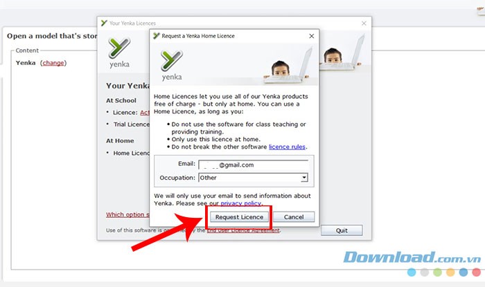 Bước 2: Để tiếp tục, hãy nhập địa chỉ Email và thông tin về nghề nghiệp hiện tại của bạn trong mục Occupation. Sau đó, nhấn vào nút Request License để gửi yêu cầu cấp phép.