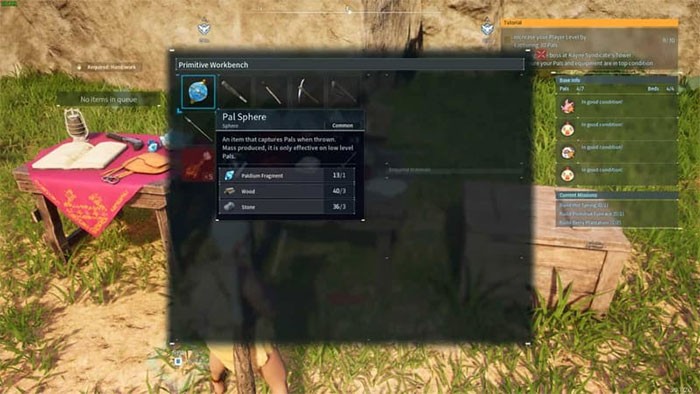 Hệ thống chế tạo trong Palworld tuân theo những nguyên tắc cơ bản, đòi hỏi người chơi phải tìm kiếm và khai thác tài nguyên. Những tài nguyên này sau đó sẽ được sử dụng để tạo ra các vật phẩm hữu ích, cũng như các loại vũ khí có thể tự chế tạo. Sau khi đã tích lũy đủ nguyên liệu cần thiết, sẽ có nhiều phương pháp chế tạo khác nhau trong Palworld, tùy thuộc vào mục đích của game thủ. Quá trình này bắt đầu với việc sử dụng Primitive Workbench.