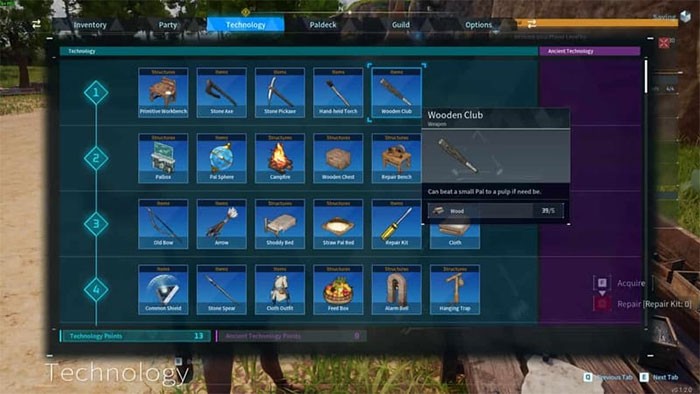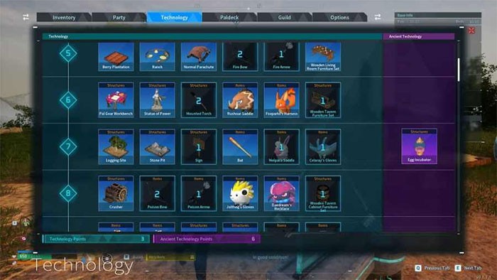 Bên cạnh việc tạo ra các bàn chế tạo, người chơi Palworld còn cần phải mở khóa các công thức để có thể sản xuất các vật phẩm khác nhau. Quá trình này được thực hiện bằng cách truy cập kho đồ của nhân vật, thao tác bằng phím tắt Tab, sau đó chuyển sang tab Technology nằm ở phía trên cùng của giao diện.